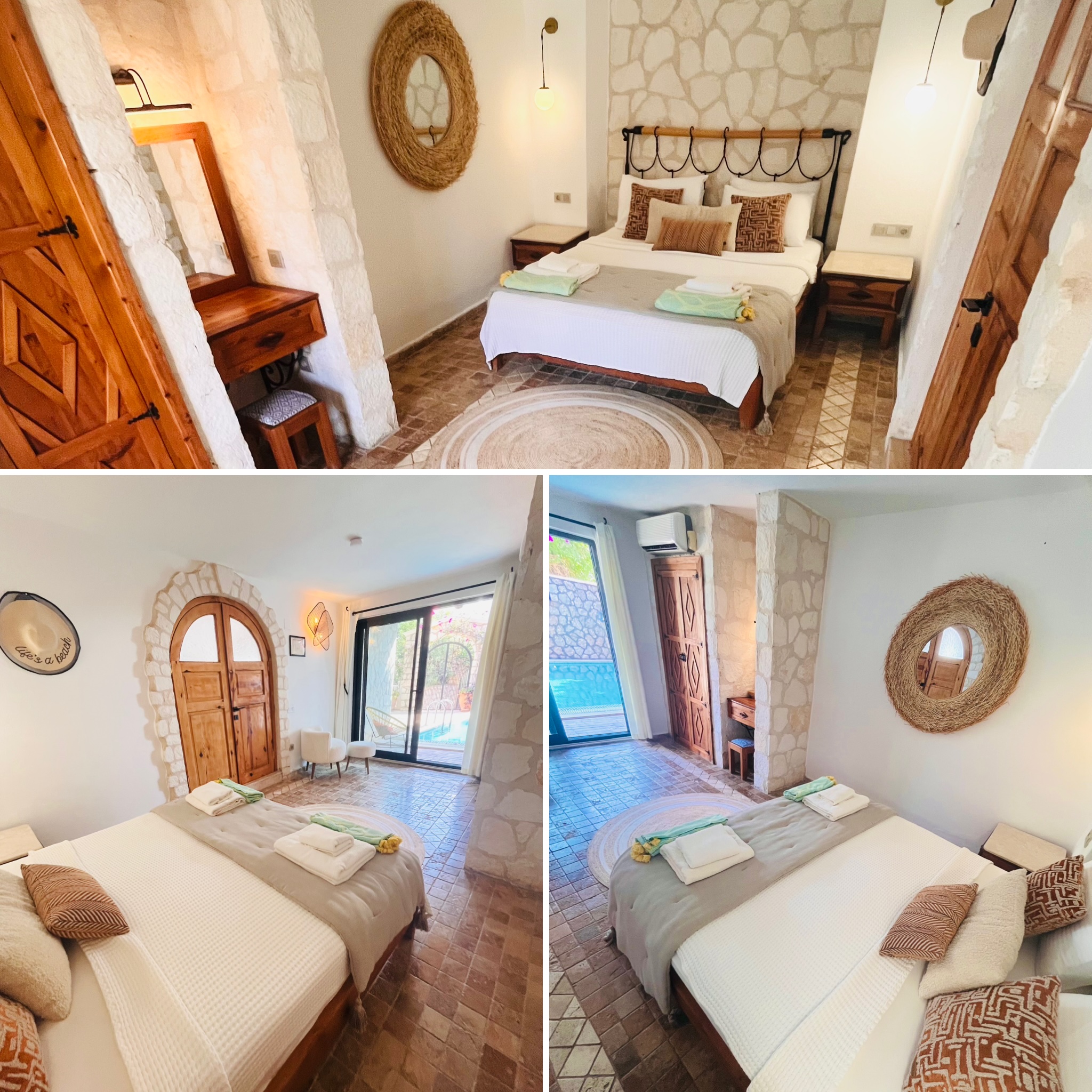 Villa Kucuk is a charming 2 bedroom villa with a homey and authentic ambience that invites you the moment you step through the wrought iron gates. Situated in a convenient yet peaceful position you can take a leisurely downhill walk to Kalkan’s high street and quaint Old Town. The villa offers a comfortable open-plan living space which opens out onto a gorgeous private pool and terrace area adorned with stunning foliage and dazzling Bougainvillea flowers. 2 generously sized bedrooms sleep up to 4 guests and the master bedroom is extra spacious and opens out onto a lower ground courtyard garden area with mature olive trees. Combining natural materials and traditional touches with modern furnishings Villa Kucuk is the ideal place for a magical Kalkan holiday.